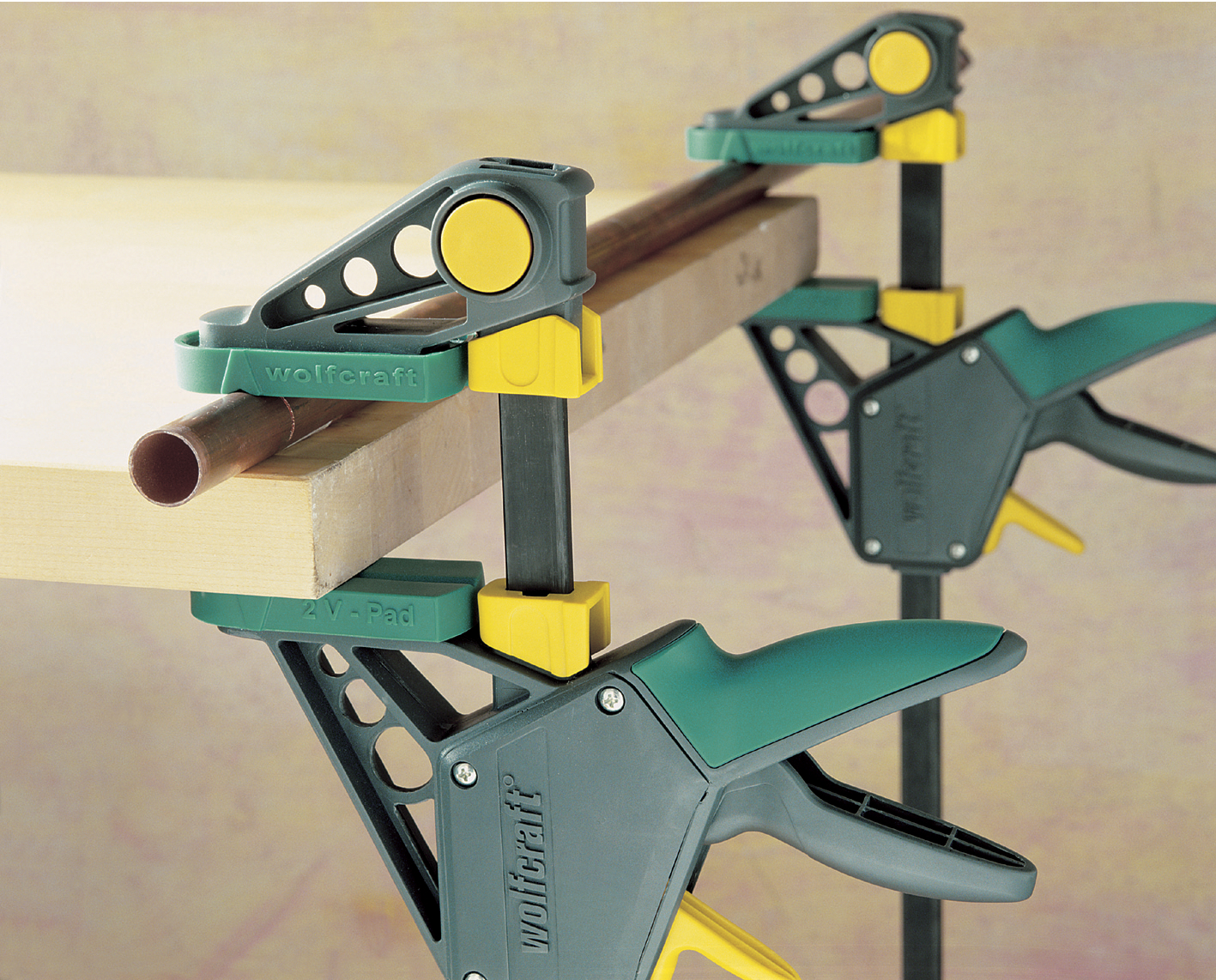 Ścisk Wolfcraft PRO jako jedyny ma dodatkowe nakładki (dystanse na szynie), które oddzielają obrabiany przedmiot od szyny nie powodując jego uszkodzeń. Mogą też być wykorzystane do oparcia ścisków na powierzchni blatu, zwłaszcza przy obróbce szuflad lub klejeniu większych przedmiotów.