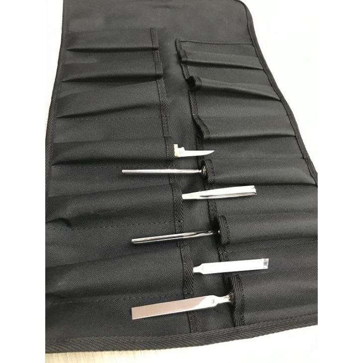 Etui dedykowane jest do przechowywania dłut rzeźbiarskich oraz noży rzeźbiarskich, ale może być również wykorzystywane do innych narzędzi o wąskich rękojeściach.