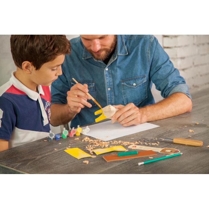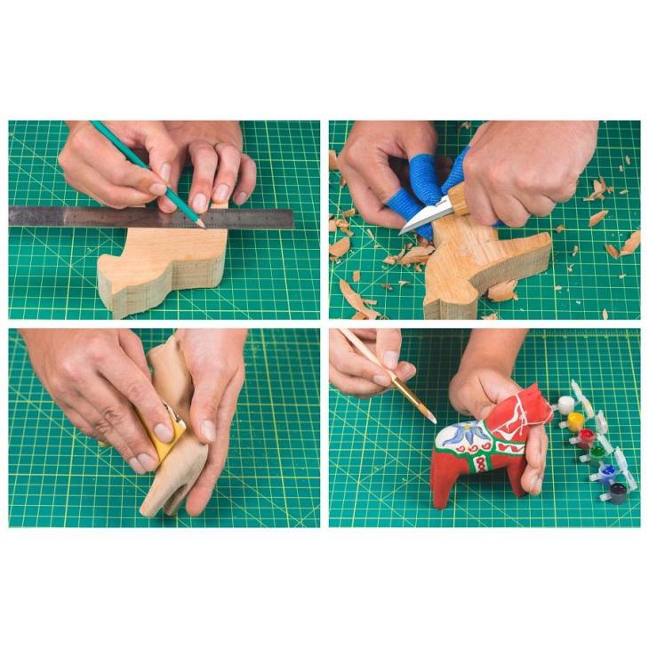 Zestaw do własnoręcznego wyrzeźbienia i pomalowania figurki Konika. Zestaw zawiera komplet narzędzi i materiałów potrzebnych do wykonania rzeźby: formatkę konika z drewna, nóż do rzeźbienia, taśmę chroniącą palce, zestaw do polerowania (polerka skórzana+pasta polerska), zestaw papierów ściernych P150, ołówek, pędzelek, farbki, instrukcję. Uwaga: Produkt nie jest zabawką i nie daje się do używania przez dzieci.