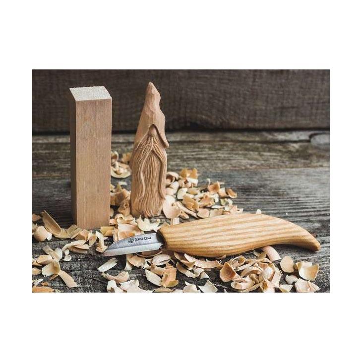Zestaw do własnoręcznego wyrzeźbienia figurki Czarodzieja. Zestaw zawiera komplet narzędzi i materiałów potrzebnych do wykonania rzeźby: 3 klocki drewna lipowego, nóż do rzeźbienia, taśmę chroniącą palce, ołówek, polerkę, szablon, instrukcję.