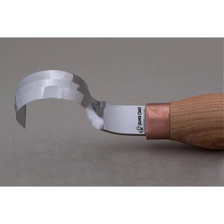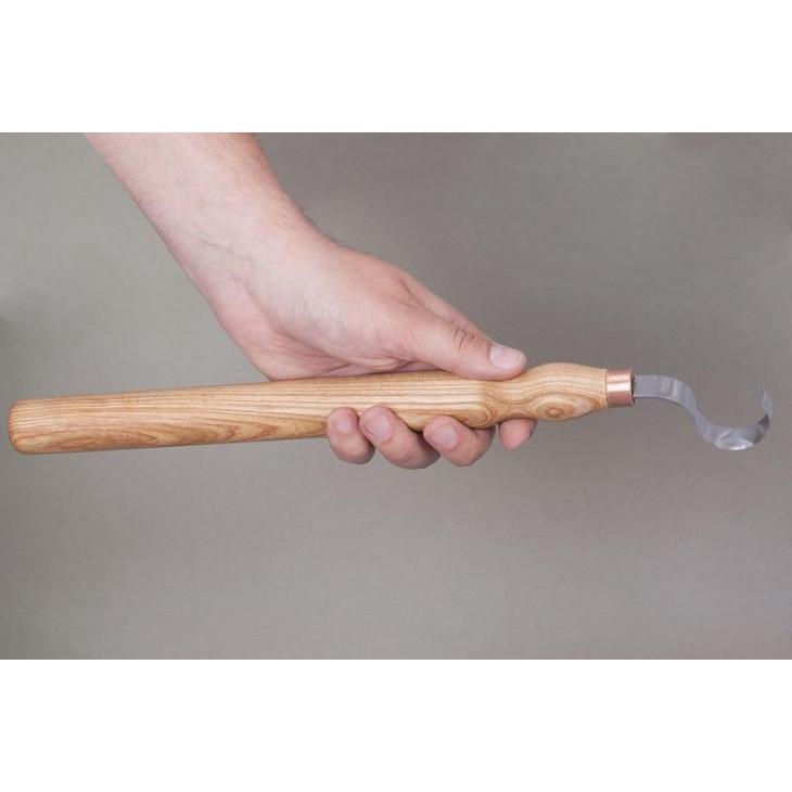 Nóż hakowy do łyżek 30mm z długą rękojeścią, ostrze obustronne - Nóż do łyżek posiada ostrze w kształcie litery U i służy do wybierania materiału przy tworzeniu łyżek, kuks i innych przyborów i naczyń. Ostrze noża posiada krawędź tnącą do samego końca ostrza, ostrze posiada krawędź tnącą po obu stronach, nadaje się do użytku przez osoby zarówno prawo, jak i leworęczne. Przedłużona rękojeść z jesionu, pozwala na wkładanie mniej siły przy rzeźbieniu. Do łyżki SK2Long dostępny jest dedykowany pokrowiec z naturalnej skóry bydlęcej (produkt BeaverCraft SH5)