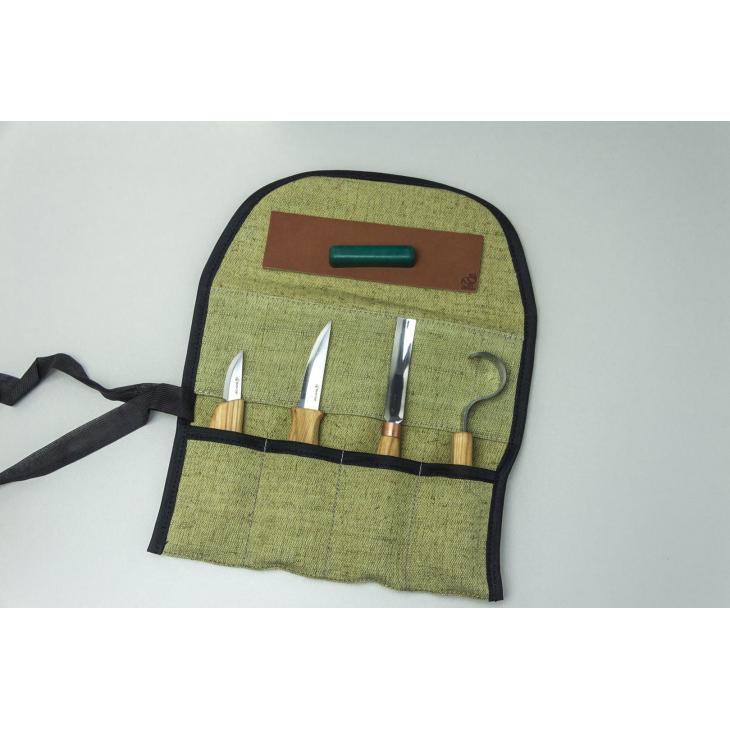 Zestaw narzędzi do rzeźbienia oraz wycinania łyżek w drewnie oraz innych projektów rzeźbiarskich. Noże rzeźbiarskie nadadzą kształt obrabianym przedmiotom, nóż hakowy wygładzi nierówności zaokrąglonych powierzchni, a dłuto żłobak pozwoli na wybranie głębszych partii w zaokrągleniach. Ostrza nożyków wykonane są ze stali wysokowęglowej. Rączki wykonane są z drewna jesionowego, pokrytego naturalnym olejem lnianym.