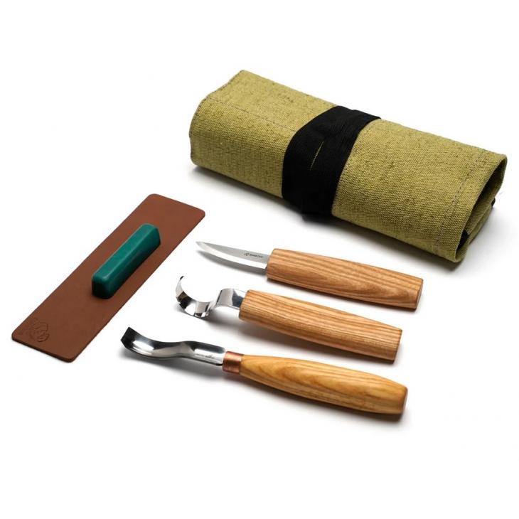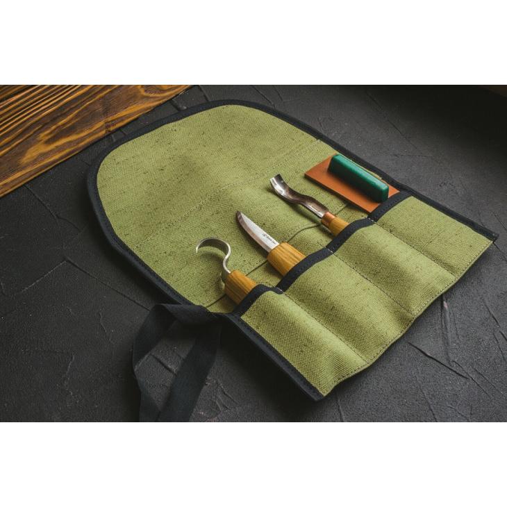 W zestawie narzędzi do rzeźbienia w drewnie S38 znajdziesz wszechstronny nóż do strugania, nóż do rzeźbienia łyżek i kompaktowy, krótko wygięty żłobak. Ale to nie wszystko. Aby ułatwić przechowywanie i transport podczas podróży, do zestawu dołączono płócienne etui na narzędzia. Zestaw S38 zawiera również skórzany pasek i zielono-szarą pastę polerską, która zapewnia najwyższą wydajność ostrzenia narzędzi. Wszystko po to, aby zapewnić Ci przyjemne i satysfakcjonujące doświadczenie rzeźbienia w drewnie