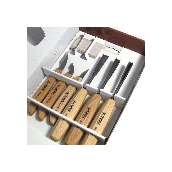 Wysokiej jakości dłuta i noże przeznaczone do amatorskich prac rzeźbiarskich w miękim drewnie. Zawiera podstawowe profile dłut i noży rzeźbiarskich. Produkt często kupowany na wyposażenie pracowni artystycznych dla dzieci.