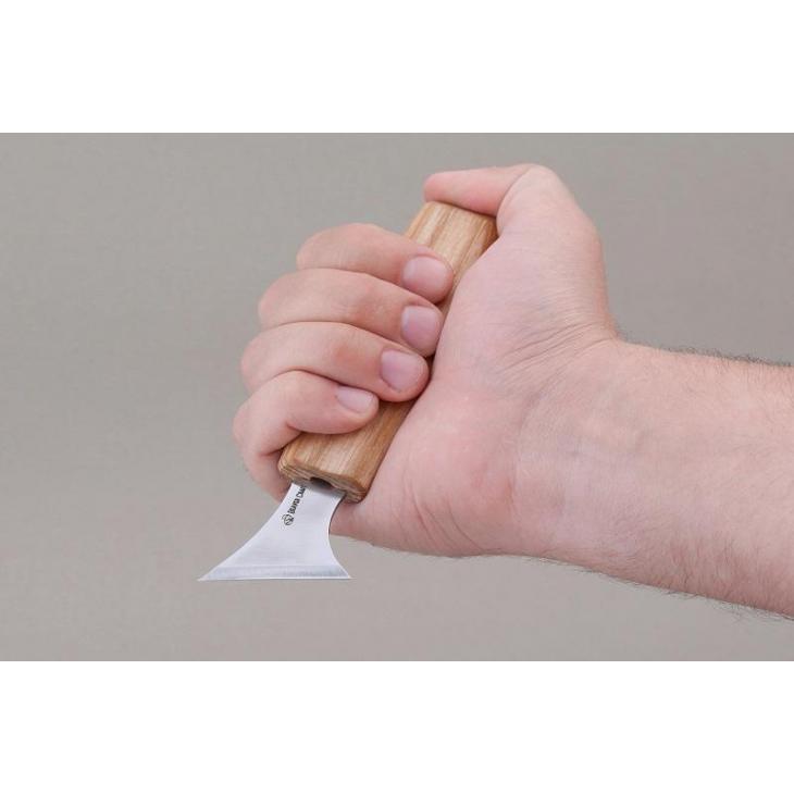Nóż ma ścięte ostrze wykonane ze stali wysokowęglowej. Doskonale sprawdza się w różnych zadaniach i technikach, zapewniając długowieczność i ostrość. Praktyczność tego narzędzia rozciąga się na jego rękojeść, wykonaną z drewna jesionowego, o ergonomicznej konstrukcji, która zapewnia wygodny i pewny chwyt, minimalizując zmęczenie dłoni podczas długich sesji rzeźbienia.