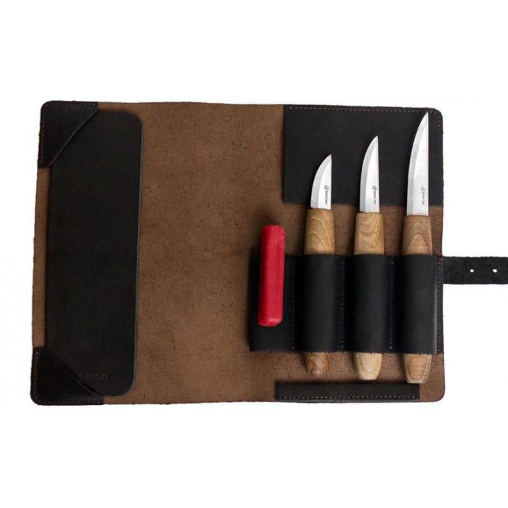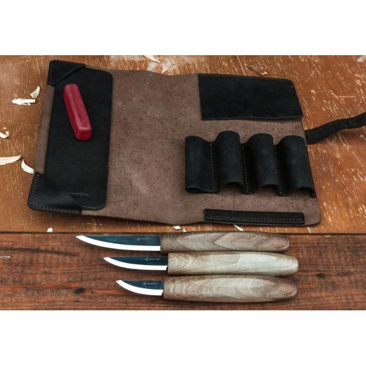 Beavercraft Zestaw 3 noży do rzeźbienia z akcesoriami polerskimi w etui skórzanym S19X