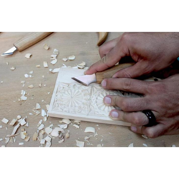 Nóż snycerski do rzeźby geometrycznej, ostrze skośne. Do wycinania elementów w kształcie linii, trójkątów, kwadratów, itd. Niewielkie ostrze pozwala na dużą precyzję cięcia. Ergonomiczna rękojeść zapewnia dobrą kontrolę narzędzia podczas pracy.