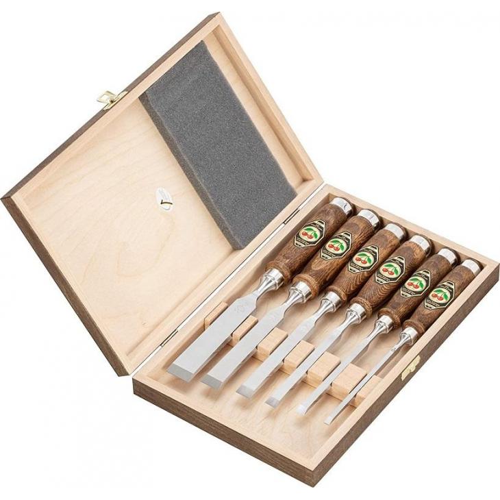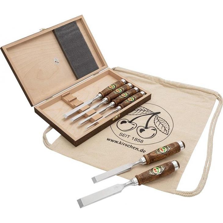 Dłuta stolarskie firmy Kirschen zestaw 6 szt - 6, 10, 12, 16, 20, 26 mm w drewnianej kasecie bejcowana rękojeść