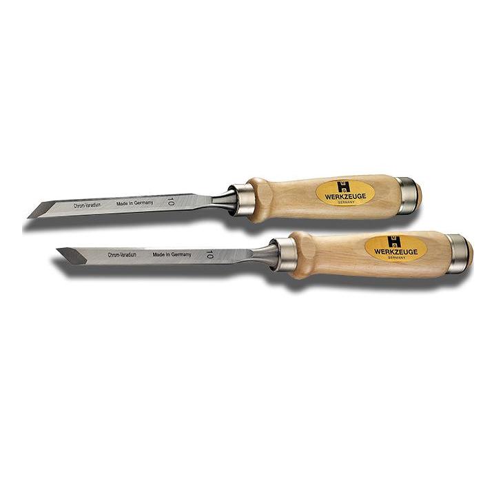 Wysokiej jakości, profesjonalne proste dłuta ciesielskie z fazowaniem bocznym. Kute ostrza wykonane są ze stali chromowo-wanadowej (Cr-V) i hartowane do uzyskania twardości 61HRc. Doskonała stal pozwala na obróbkę bardzo twardego drewna. Spełniają wymagania normy DIN 5139. Rękojeści dłut wykonane są z wysokiej jakości lakierowanego drewna grabowego. Polecane szczególnie do obróbki miejsc, w których dłuto proste jest za szerokie.