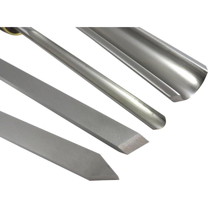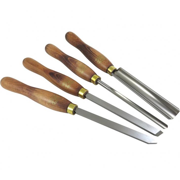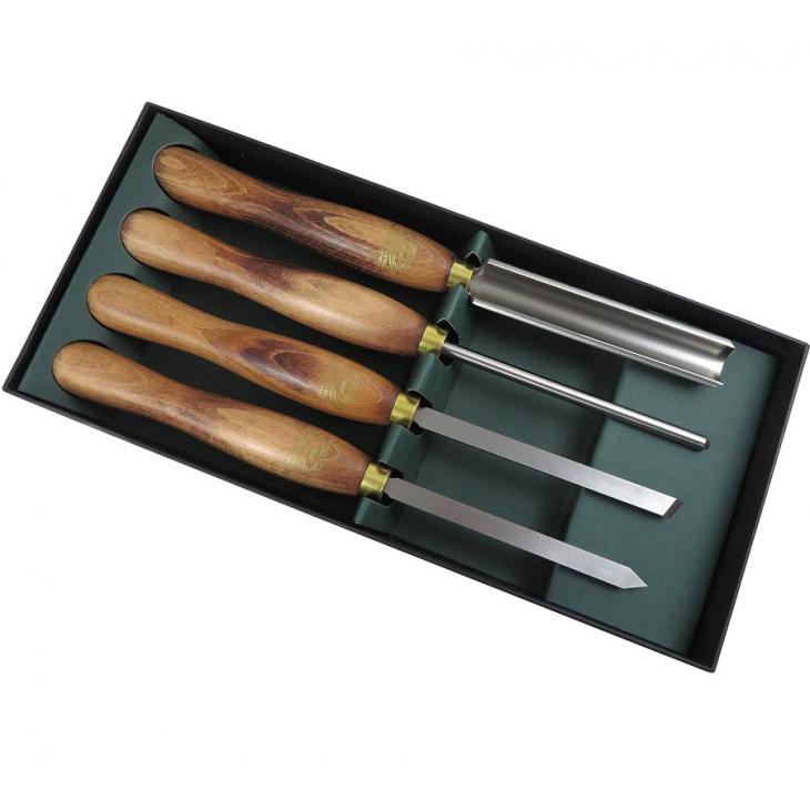 Zestaw zawiera następujące elementy: dłuto do obróbki zgrubnej 3/4" (19mm), dłuto do toczenia wzdłużnego 3/8" (9mm), przecinak 1/4" i dłuto skośne 1/2" (13mm)