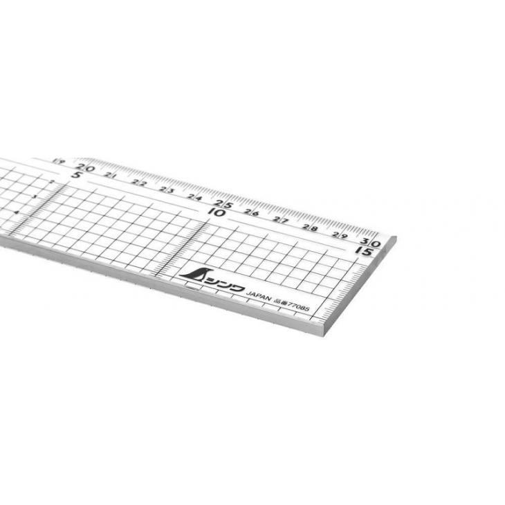 SHINWA 77085 to profesjonalny liniał (przymiar) do cięcia nożem przydatny podczas przecinania krótkich odcinków np. tektury, papieru, tworzywa Wykonany z akrylu, przejrzysty, dzięki naniesionej podziałce umożliwia mierzenie oraz łatwe przenoszenie wymiarów podczas cięcia i kreślenia