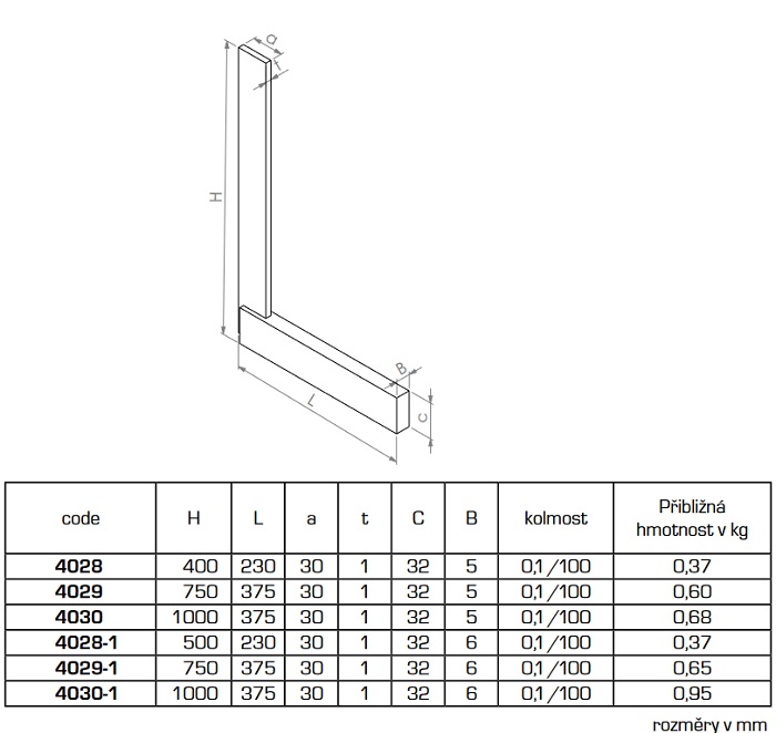 - Szerokość ramion 30mm, grubość dolnego 5 mm, grubość cieńszego 1 mm