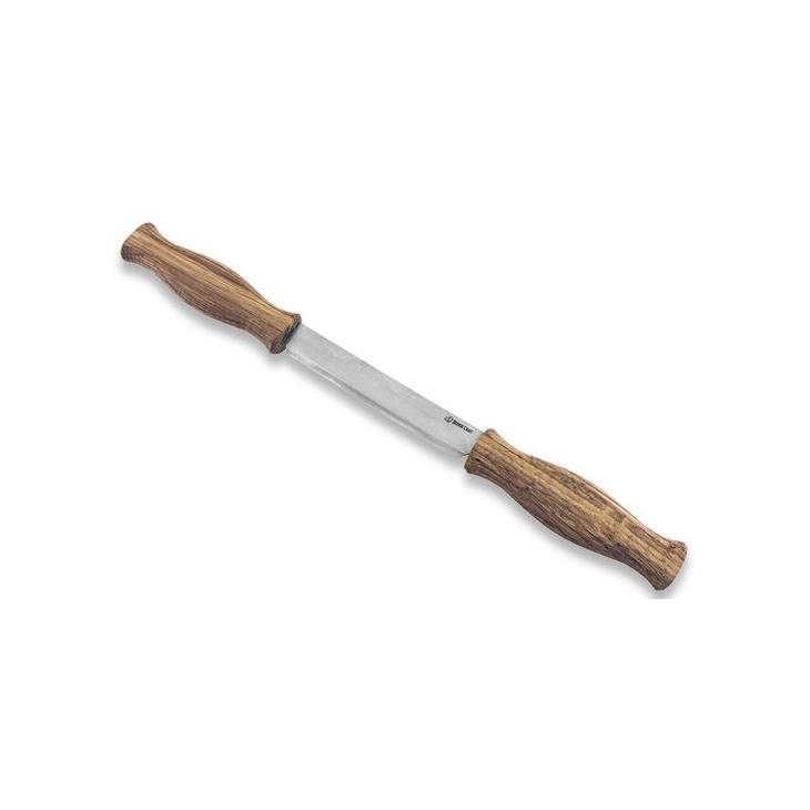 Ośnik prosty z ostrzem o grubości 2mm, doskonale nadaje się do prac wykończeniowych. Najczęściej ośnik stosowany jest do obróbki dłuższych elementów z drewna, którym chcemy nadać okrągłe/zaokrąglone lub eliptyczne kształty, np. nogi do stołów, trzonki i miseczki łyżek. Przedmiot obrabiany mocuje się np. w imadle stolarskim, kobylicy, itp. a ośnikiem pracuje się do siebie (ciągnąc). W komplecie z pokrowcem z naturalnej skóry bydlęcej. Rękojeści z olejowanego dębu.