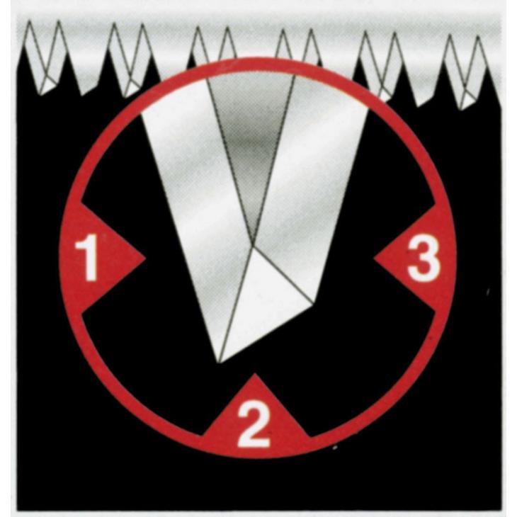 - Agresywna geometria hartowanych zębów umożliwiająca szybsze cięcie