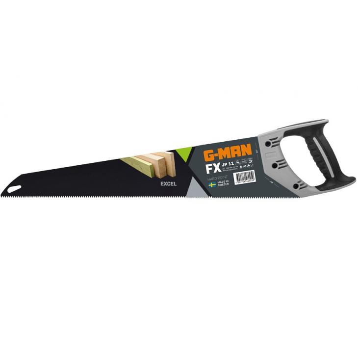 Linia FX LINE - piły najwyższej jakości. Piły są wyposażone w ergonomiczny uchwyt z miękkim uchwytem. Linia FX ma również grubszy materiał ostrza, który redukuje wibracje i zapewnia dodatkową stabilność i precyzję. Trzy modele mają specjalny rodzaj zębów (JP) z 3 krawędziami tnącymi. Wraz ze specjalnym ustawieniem i powłoką o niskim współczynniku tarcia, te piły stanowią szczyt linii pił ręcznych G-MAN.