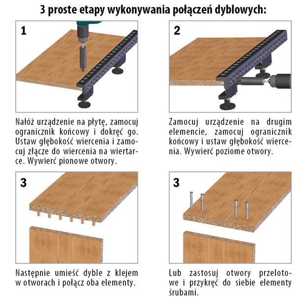 Uniwersalne urządzenie do wiercenia zaprojektowane w celu dokładnego i wydajnego dyblowania elementów mebli. Urządzenie pomaga uzyskać wysoką precyzję i wydajność pracy. Otwory rozmieszczone w odstępie co 32 mm, co jest zgodne z normą euro dla dyblowania maszynowego. Urządzenie do dyblowania zaprojektowano dla wierteł CMT i trzpienia 8 mm, wykonanych z materiału HM, zamocowanych do specjalnego złącza do wiercenia.