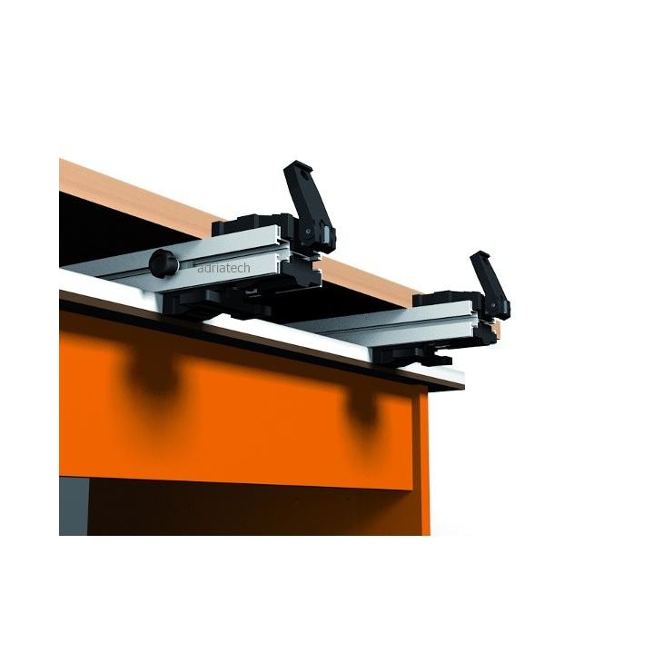 Połóż zacisk na stole, następnie połóż na nim drugi i złącz za pomocą łącznika typu "T". Używając dolnych zacisków przytwierdź ścisk do stołu, następnie używając górnych zacisków zamocuj obrabiany element. Obydwa elementy mogą być używane jako osobne zaciski.