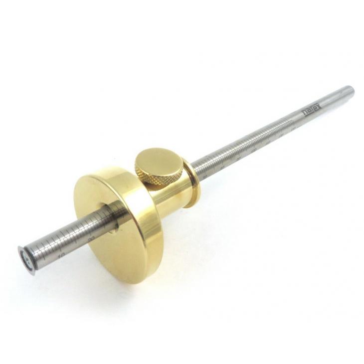 Prowadnica o długości 190mm jest wykonana z polerowanej stali nierdzewnej z podziałką metryczną i imperialną. Podziałki rozciągają się do 5 cali, ale maksymalna odległość, jaką można na nich narysować, to 6 cali. Frez 3/8 cala jest wykonany z hartowanej stali narzędziowej i można go całkowicie schować w głowicy, aby chronić, gdy nie jest używany. Ponadwymiarowa śruba skrzydełkowa z litego mosiądzu o średnicy 5/8 cala bezpiecznie blokuje głowicę na prowadnicy. Narzędzie to doskonale leży w dłoni dzięki doskonałej stosunkowo dużej masie i dobremu wyważeniu.