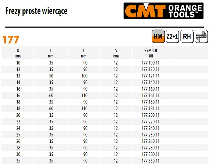 Tabela wymiarowa frezów prostych z ostrzem wiercącym firmy CMT ORANGE TOOLS
