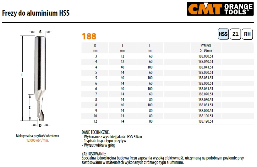 Tabela wymiarowa frezów do aluminium HSS firmy CMT ORANGE TOOLS