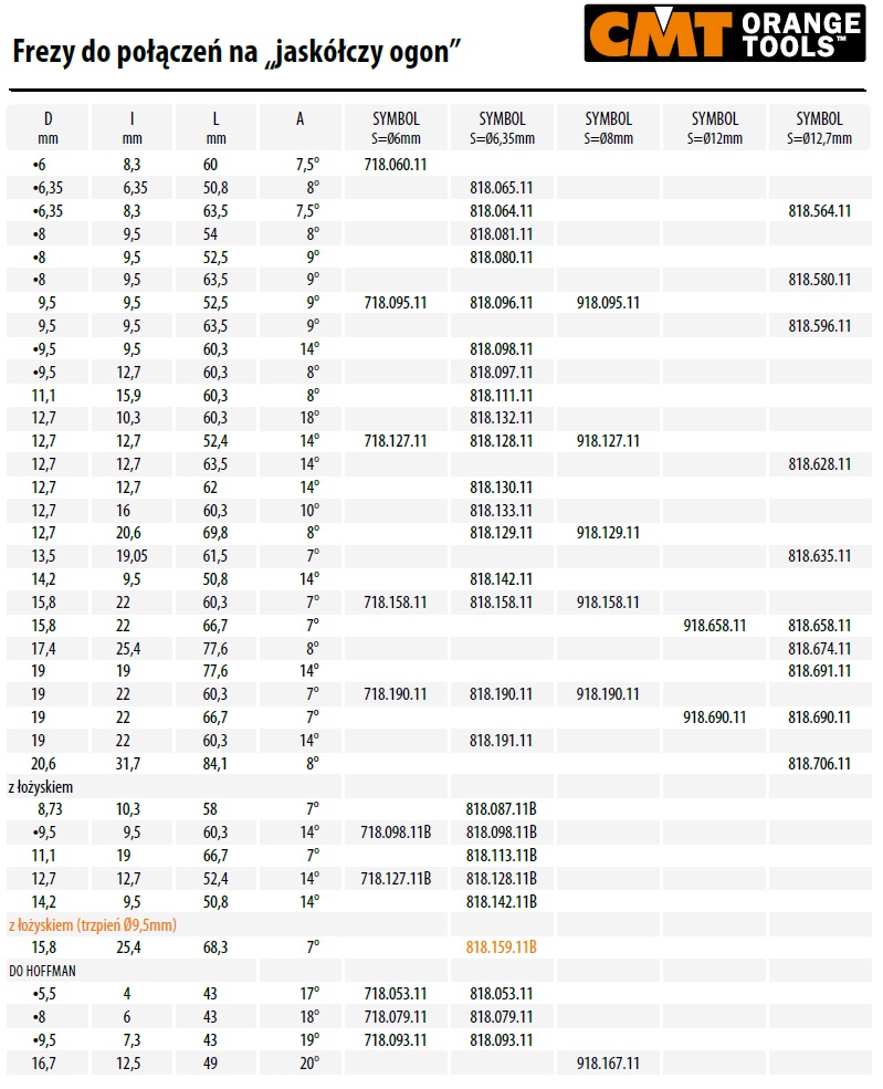 Tabela wymiarowa frezów do połączeń na jaskółczy ogon serii 718, 818 i 918 firmy CMT ORANGE TOOLS