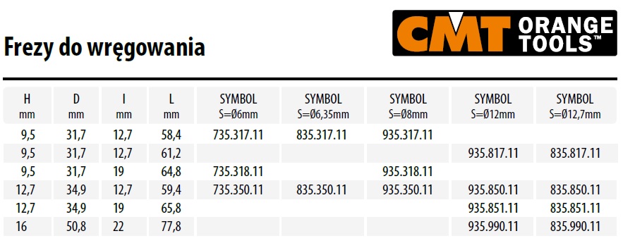Tabela wymiarowa frezów do wręgowania firmy CMT ORANGE TOOLS