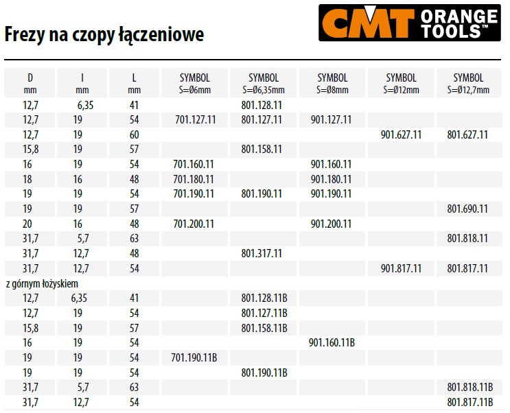 Tabela wymiarowa frezów na czopy łączeniowe serii 701, 801 i 901 firmy CMT ORANGE TOOLS