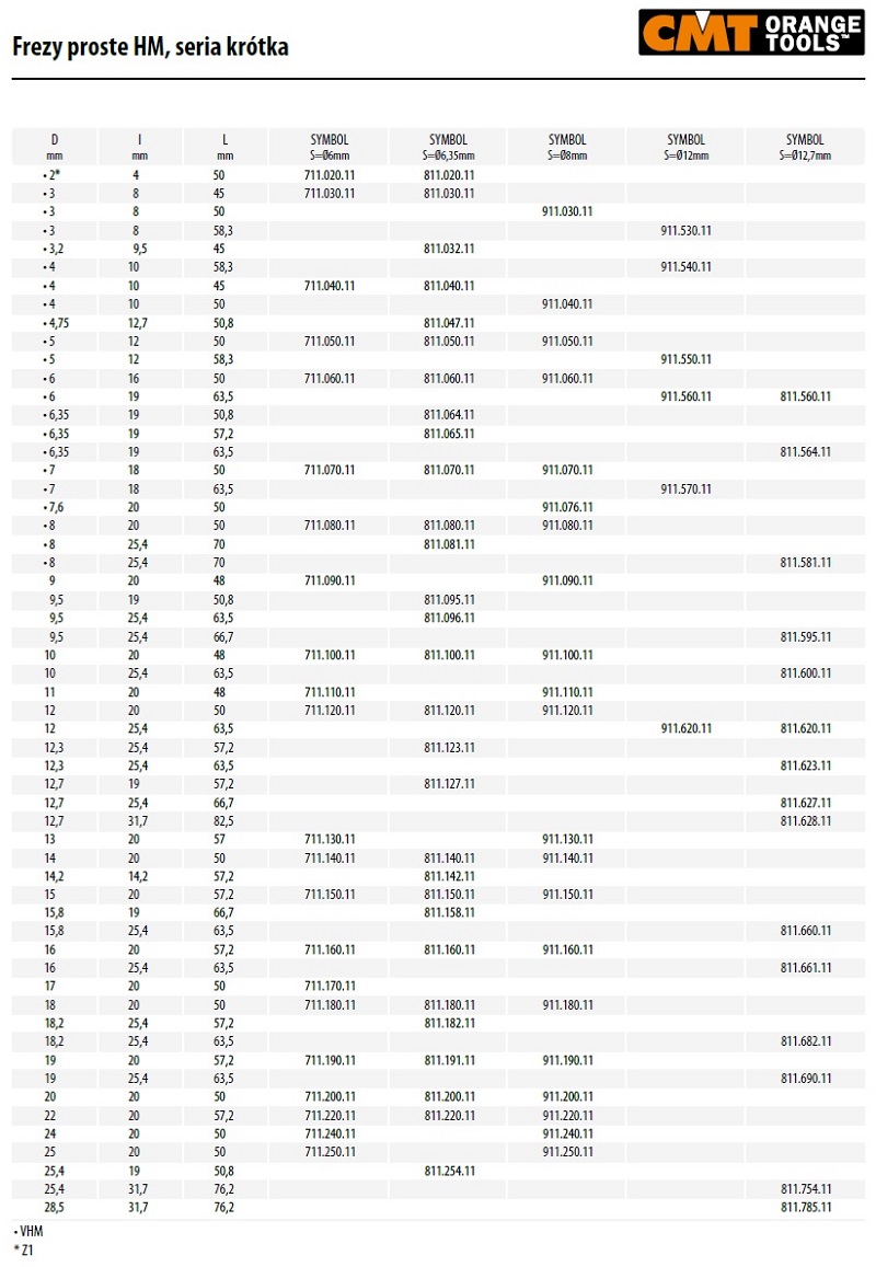 Tabela wymiarowa frezów prostych krótkich serii HM firmy CMT ORANGE TOOLS