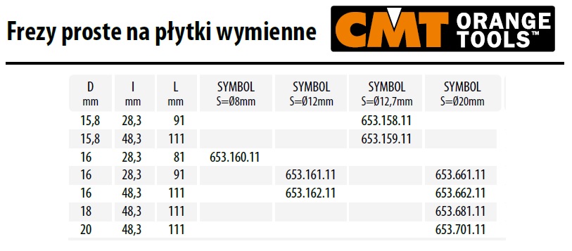 Tabela wymiarowa frezów prostych na płytki wymienne serii 653 firmy CMT ORANGE TOOLS
