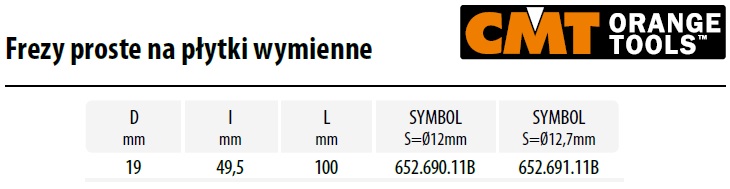 Tabela wymiarowa frezów prostych na płytki wymienne serii 652B firmy CMT ORANGE TOOLS