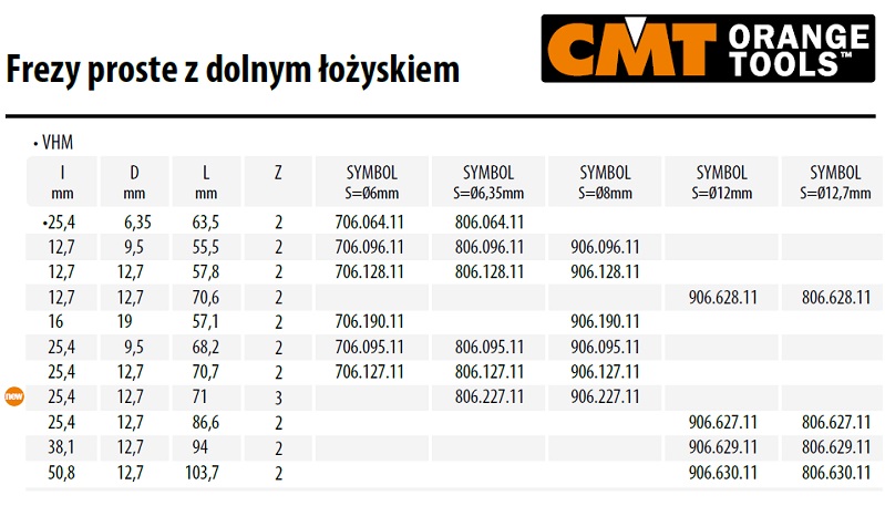 Frez prosty z dolnym łożyskiem o długości roboczej I-50,8 mm o średnicy D-12,7 mm firmy CMT ORANGE TOOLS.