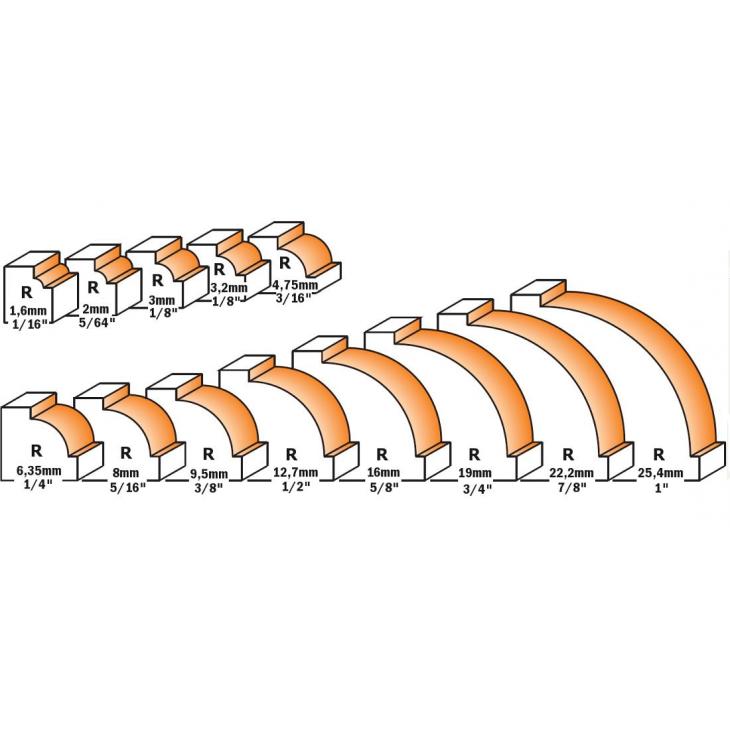 Tabela wymiarowa frezów zaokrąglającyh serii 739/839/939 firmy CMT ORANGE TOOLS