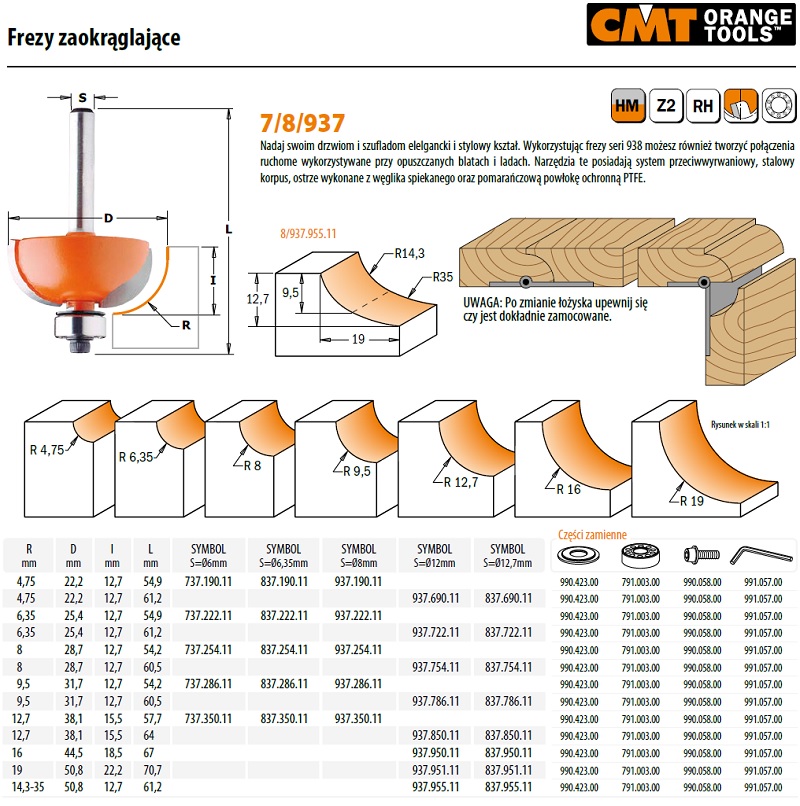 Tabela wymiarowa frezów zaokrąglającyh serii 737/837/937 firmy CMT ORANGE TOOLS