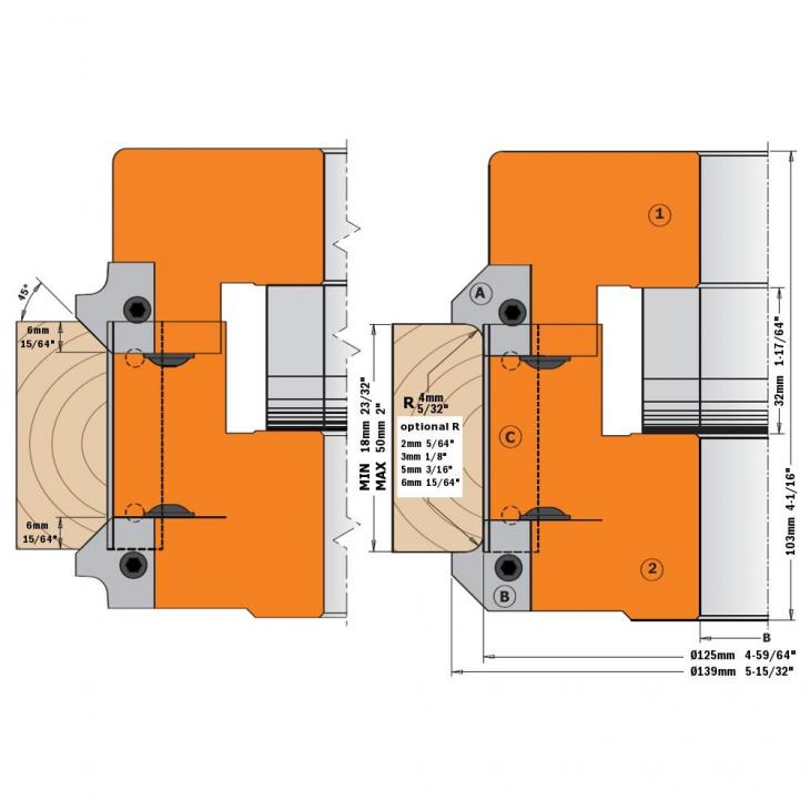 Regulowany zestaw głowic do zaokrąglania i fazowania o średnicy D-139mm, otwór 35mm do frezarek dolnowrzecionowych i formatyzerek CMT ORANGE TOOLS