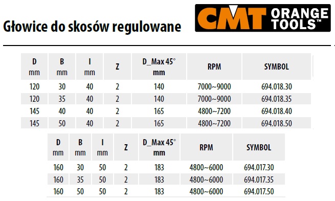 Głowica regulowana do skosów do frezarek dolnowrzecionowych i formatyzerek, średnica 145 mm, średnica otworu 50 mm firmy CMT ORANGE TOOLS.