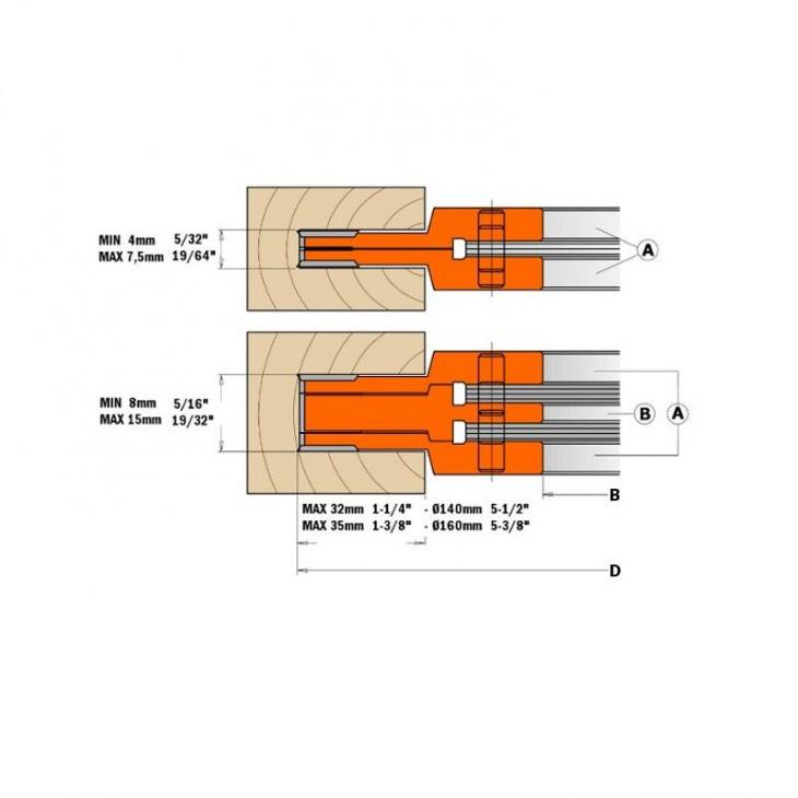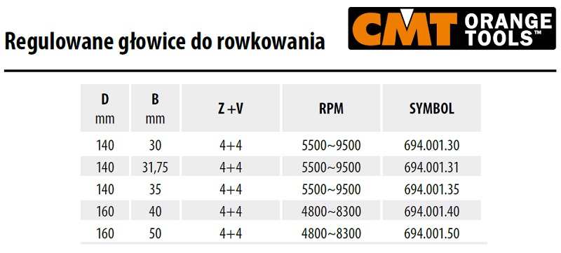 Głowica regulowana do rowkowania do frezarek dolnowrzecionowych i formatyzerek, średnica głowicy 140 mm, średnica otworu 35 mm, do wykonywania rowków o wysokości 4÷15mm firmy CMT ORANGE TOOLS.