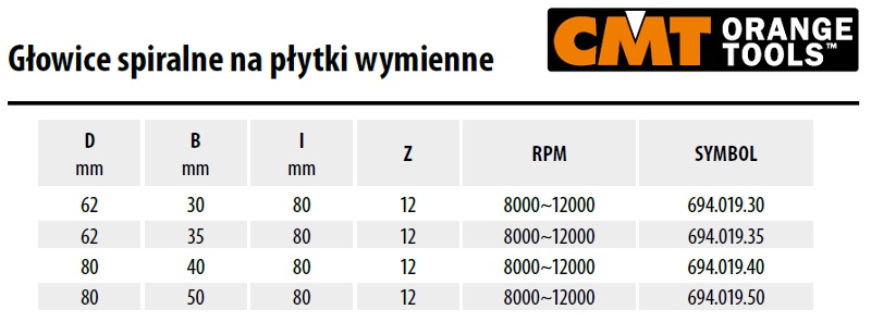 Głowica spiralna na płytki wymienne do frezarek dolnowrzecionowych, średnica głowicy 62 mm, średnica otworu 30 mm, do strugania w miękkim i twardym drewnie CMT ORANGE TOOLS.