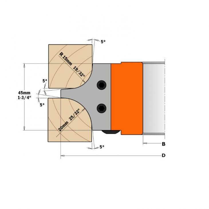 Uniwersalna głowica frezująca do zaokrąglania, mająca możliwość zamontowania dwóch różnych zestawów noży, tworzących zaokrąglenie w zakresie 4 różnych promieni frezowania.