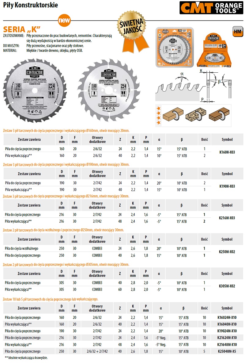 Tabela wymiarowa pił budowlanych serii K firmy CMT ORANGE TOOLS