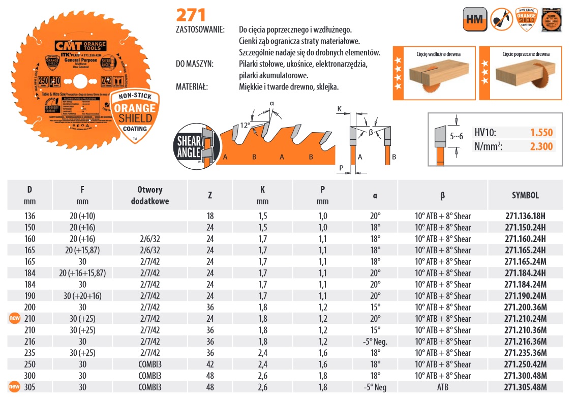 Tabela wymiarowa pił do metali nieżelaznych i płyt laminowanych 296/297 firmy CMT ORANGE TOOLS