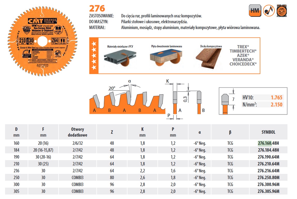 CMT Piła do cięcia alu laminatów materiałów nieżelaznych D-160 F-20 zębów 48 (276.160.48H)