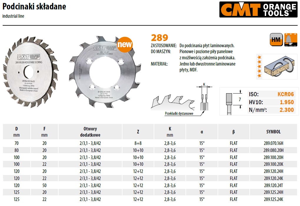 Tabela wymiarowa podcinaków trapezowych do płyt laminowanych 289 firmy CMT ORANGE TOOLS