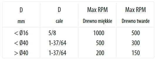 Maksymalne prędkości obrotowe dla sękowników CMT Orange Tools