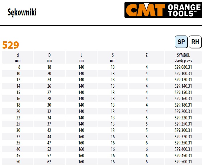 Tabela wymiarowa sękowników metrycznych serii 529 firmy CMT ORANGE TOOLS