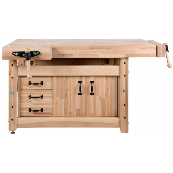 Bardzo stabilny stół stolarski z 2 imadłami (typ Bench11 - HV516). Blat roboczy wykonany z drewna bukowego o 120 mm grubości!! Dzięki wyjątkowo solidnej konstrukcji stół ten jest odpowiedni zarówno dla profesjonalnych stolarzy jak i dla majsterkowiczów, dla każdego warsztatu i zakładu stolarskiego. Waga stołu 158 kg. Blat roboczy jest olejowany i polerowany. W blacie wykonane są otwory fi19mm do montażu imaków lub innego osprzętu.