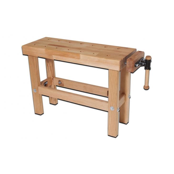 Profesjonalny i stabilny stół stolarski z imadłem dostosowany do wzrostu dzieci i młodzieży szkolnej. Blat roboczy wykonany z desek bukowych 80 mm grubości. Kompaktowe rozmiary i solidność wykonania gwarantują zadowolenie młodego użytkownika. Stół można kupić w trzech wersjach wysokości (500,700,850 mm) dopasowując ją do wzrostu. Górny blat roboczy jest olejowany i polerowany. Do stołu dołączono imadło o bardzo trwałej konstrukcji i prostej obsłudze Bench 10 czeskiego producenta. W zestawie dwa ogranicznik (haki) do mocowania przedmiotów z aluminium o średnicy 25 mm. Dzięki metalowej kulce połączonej ze sprężyną można wsunąć i zamocować ograniczniki w otwory stołu.