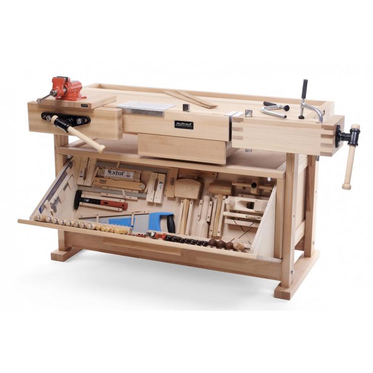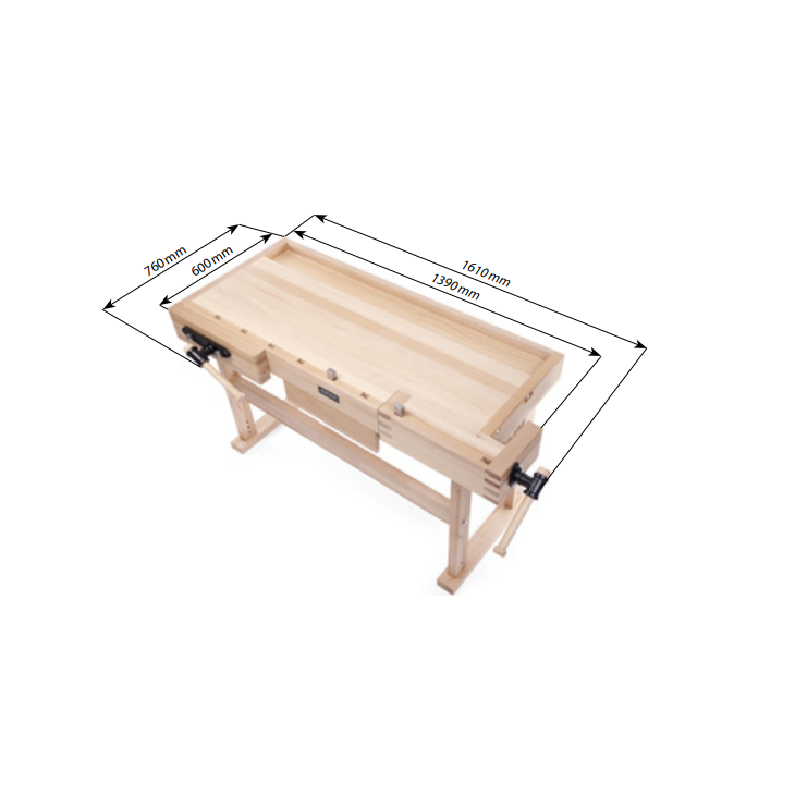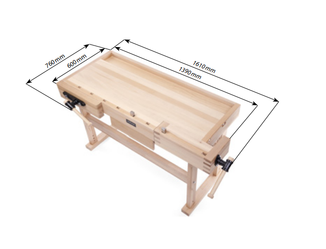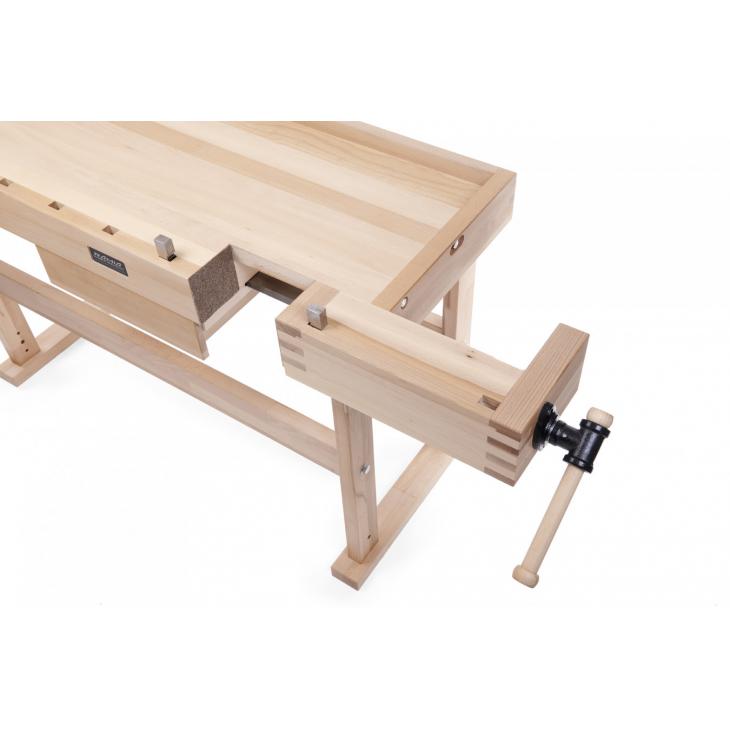 Model PREMIUM.A2 wyposażony jest w dwa dociski z wysokiej jakości gwintem trapezowym, który zapewnia skuteczne oraz mocne ściskanie materiału. W bocznym docisku umieszczono dwa otwory na imaki. Pozostałe 9 otworów rozlokowanych jest na blacie stołu. Wygodna szuflada pozwala na trzymanie najbardziej potrzebnych oraz często używanych narzędzi. Koryto na narzędzia znajduje się w tylnej części blatu. Łączenie na wczepy gwarantuje bardzo wysoką odporność i żywotność stołu. Jest to jedna z najwytrzymalszych konstrukcji o szerokim zastosowaniu.